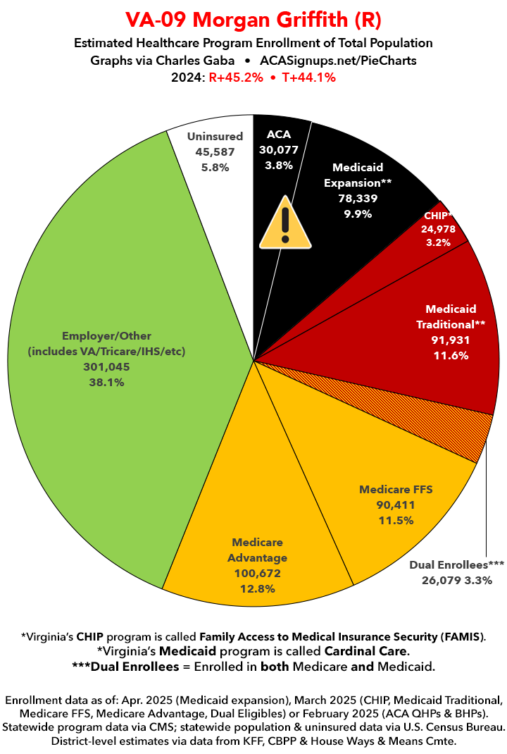UPDATE 7/15/25: I've updated the web versions of the graphics with the most up-to-date enrollment data I have access to. The black sections w/the ⚠️ symbol are those most at risk of losing healthcare coverage due to H.R. 1, the "One Big Beautiful Bill Act" (aka the #MAGAMurderBill).