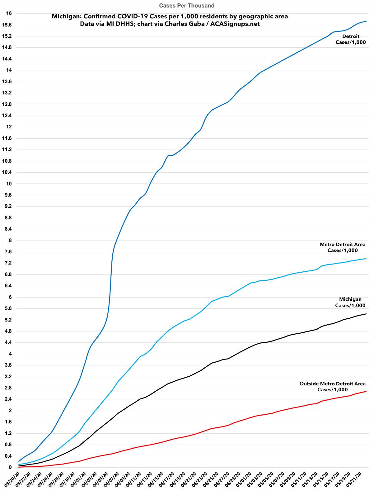 Obviously the probem is still far worse in Detroit and the Metro Detroit area overall...but the case trendlines are starting to flatten in Detroit and Metro Detroit, while it's still increasing at the same rate or higher in the rest of the state.