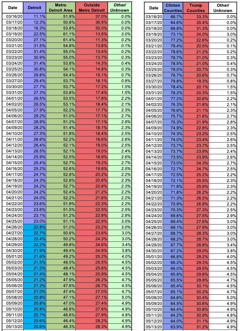 A few weeks ago, I posted a detailed analysis of how the COVID-19 virus has been spreading throughout my home state of Michigan. I noted that while the outbreak originally spread quickly in Detroit and the more densely-populated Metropolitan Detroit region (Wayne, Oakland and Macomb counties), that has gradually changed over time, with the virus spreading to the rest of the state--including rural, conservative-leaning areas--at a faster rate while it slowed down in the urban areas.