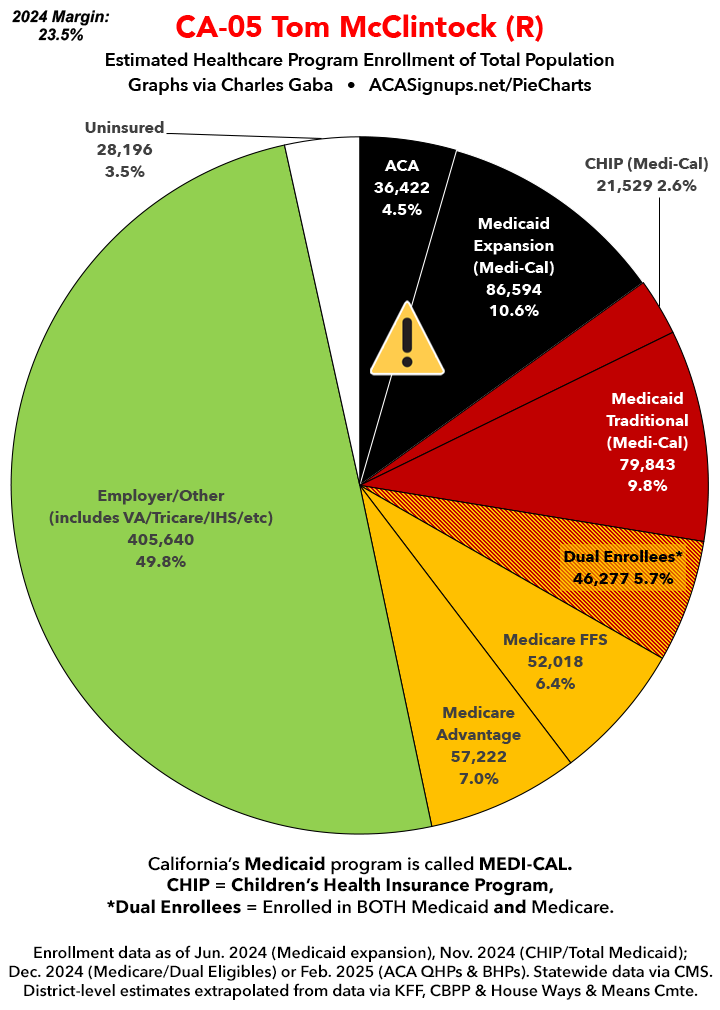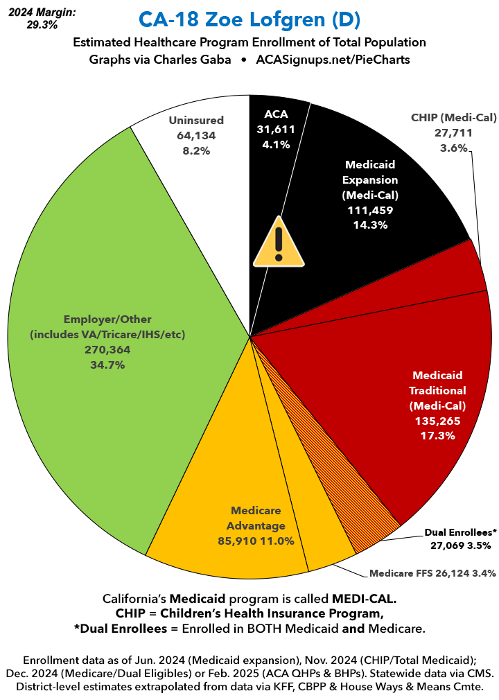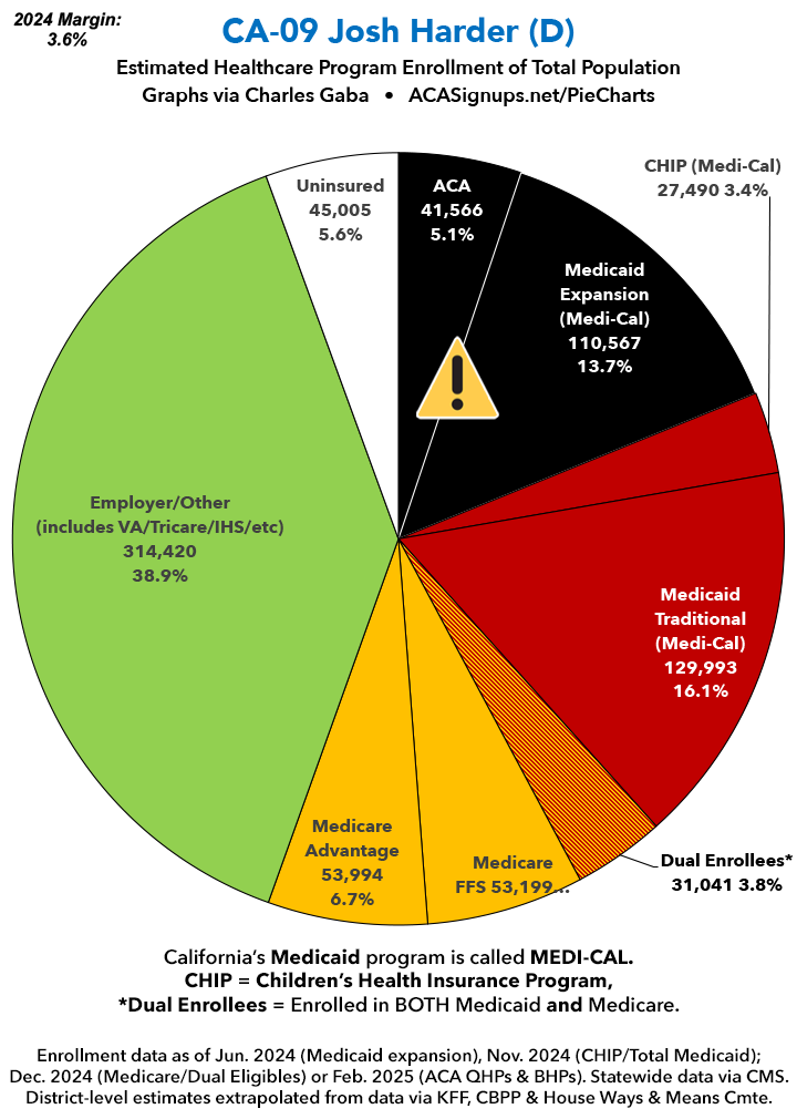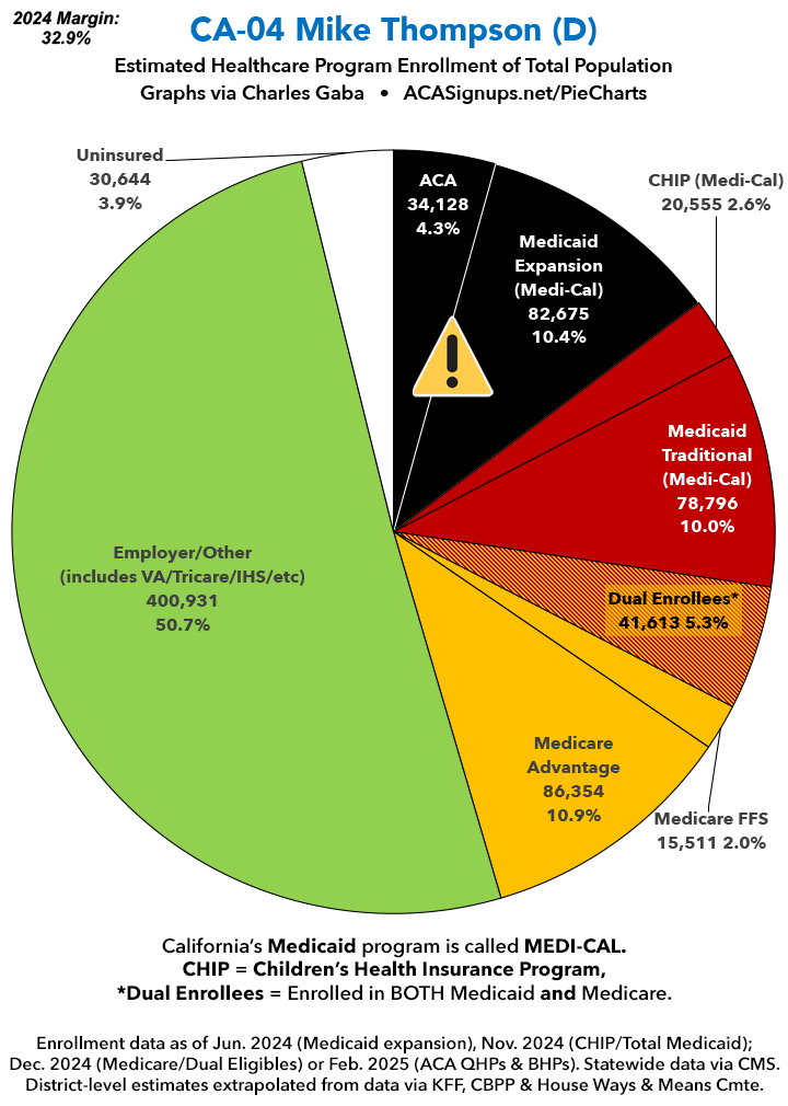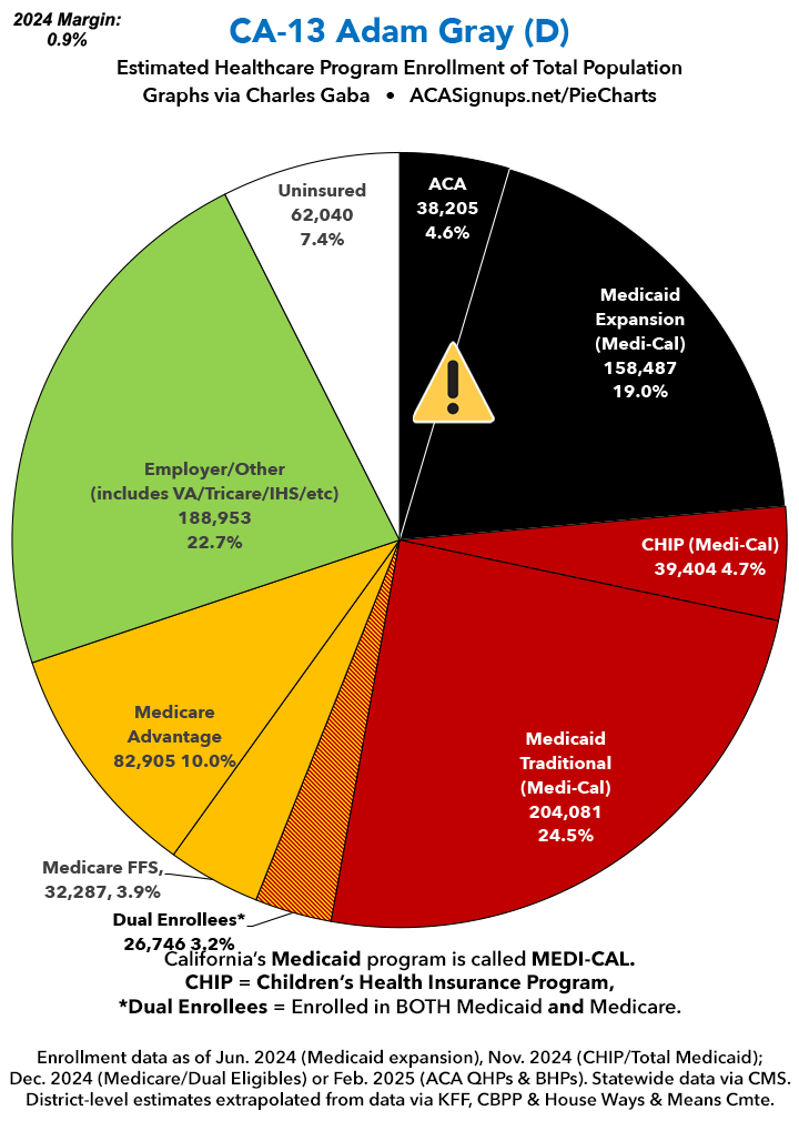 With the pending dire threat to several of these programs (primarily Medicaid & the ACA) from the House Republican Budget Proposal which recently passed, I'm going a step further and am generating pie charts which visualize just how much of every Congressional District's total population is at risk of losing healthcare coverage.