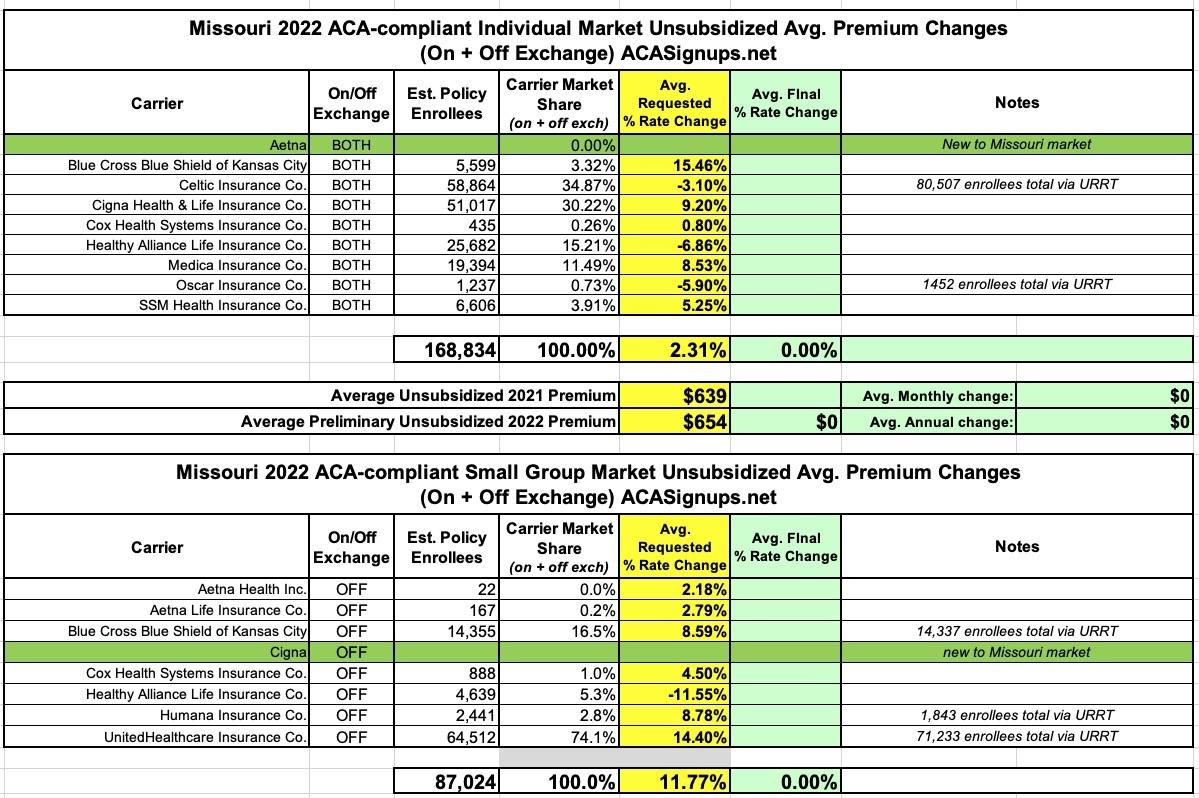 It's worth noting that each market has a new entrant for 2022: Aetna is joining the individual market while Cigna is jumping into the off-exchange Small Group market.