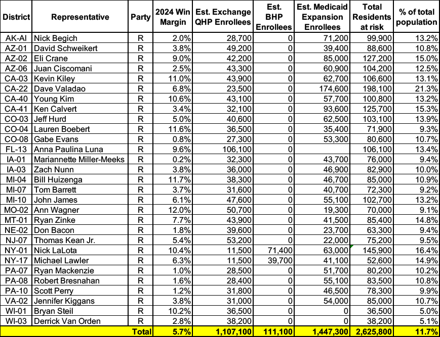 Below I've posted district-wide healthcare coverage enrollment estimates for all 29 of these House districts for reference. On average, at least 11.7% of their total populations (1 out of every ~8.5 residents) is at risk of losing healthcare coverage assuming a) the #MedicaidMassacre bill passes & is implemented and b) the GOP-controlled Congress fails to extend the improved federal APTC subsidies included in the Inflation Reduction Act (IRA) several years ago beyond 2025.