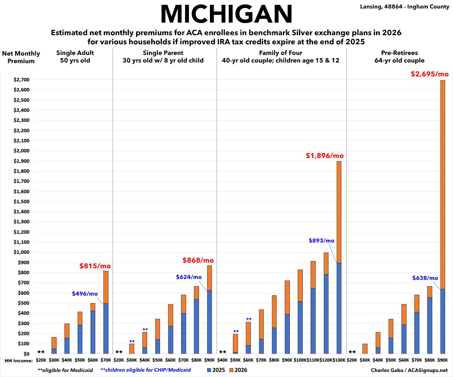 Michigan has around 531,000 residents enrolled in ACA exchange plans, 91% of whom are currently subsidized. I estimate they also have another ~64,000 unsubsidized off-exchange enrollees.