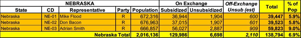 Nebraska has around ~136,000 residents enrolled in ACA exchange plans, 95% of whom are currently subsidized. I estimate they also have another ~2,000 unsubsidized off-exchange enrollees.