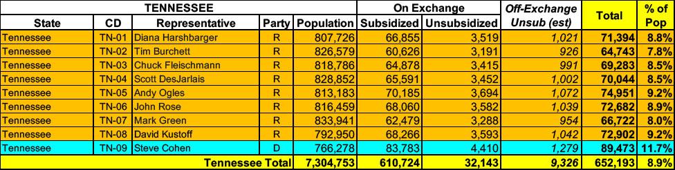 Tennessee has around ~642,000 residents enrolled in ACA exchange plans, 95% of whom are currently subsidized. I estimate they also have another ~9,000 unsubsidized off-exchange enrollees.