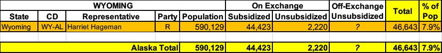Wyoming has ~46,000 residents enrolled in ACA exchange plans, 95% of whom are currently subsidized. They also have an unknown number of off-exchange enrollees (likely only a few thousand at most). Combined, that's around 8% of their total population.