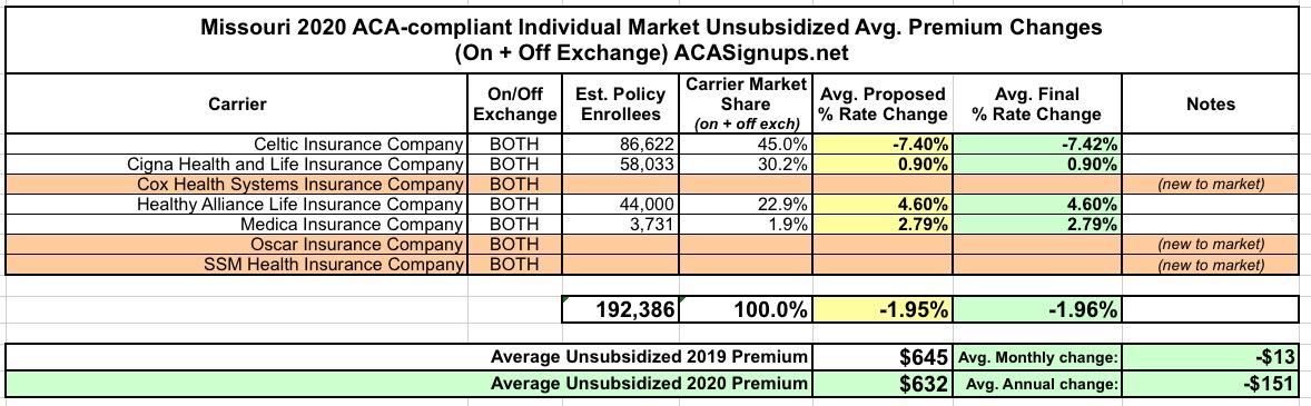 Missouri's final/approved avg. 2020 unsubsidized premium rate changes have finally been posted by CMS. For the most part they're following the same pattern as most other states this year with modest increases or decreases and a statewide weighted average decrease of 2.0% year over year. On average, unsubsidized ACA enrollees should pay about $13/month less next year than they are today.