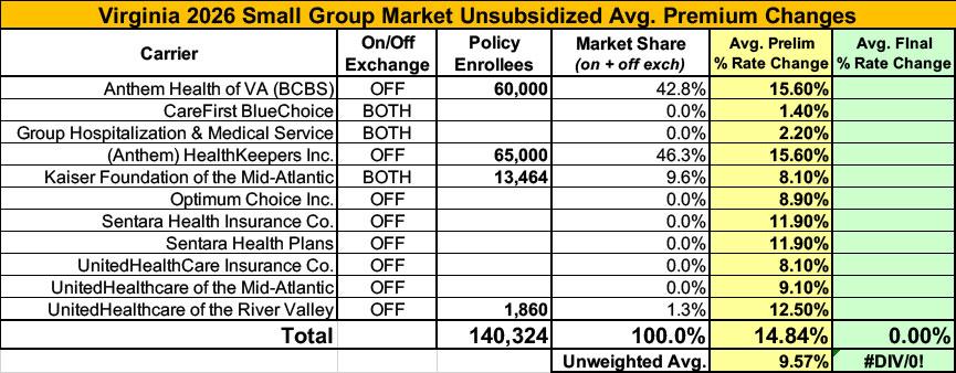 Meanwhile, I have no enrollment data at all for most of the small group carriers; the unweighted average 2026 rate hike there is around 9.6%.