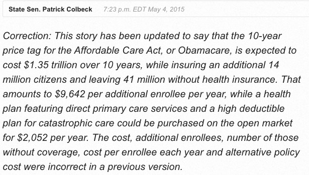 A week ago I posted a story in which I busted Michigan State Senator Patrick Colbeck for blatantly spewing nonsense numbers about the ACA in an Op-Ed in the Detroit News.