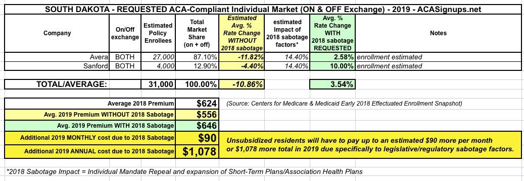 I'm not sure how this happened, but it looks like I missed posting about South Dakota's requested 2020 premium rate filings. No matter, though, because the approved avg. rate increases (for unsubsidized enrollees) are exactly the same as what Avera Health Plan and Sanford Health Plan asked for anyway.